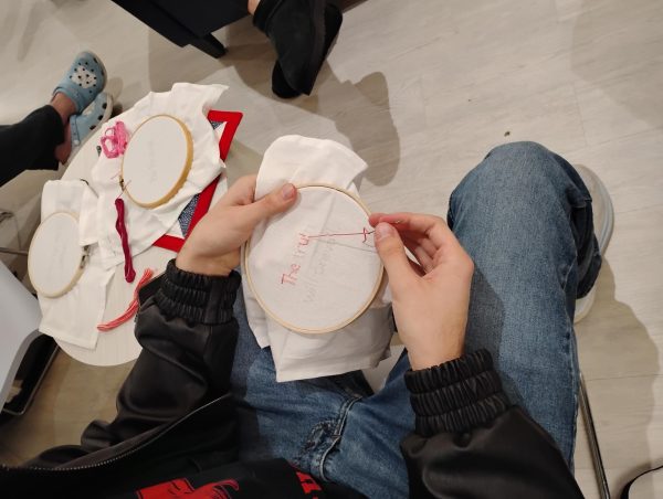 A hands-on project, the activity encourages reflection on civic engagement and community unity. Maloney guides each participant through the process from choosing a saying to learning how to sew, all the while symbolizing hope, freedom, and the power of collective action.