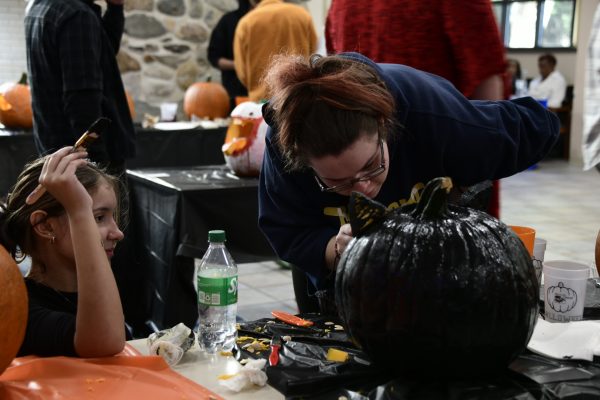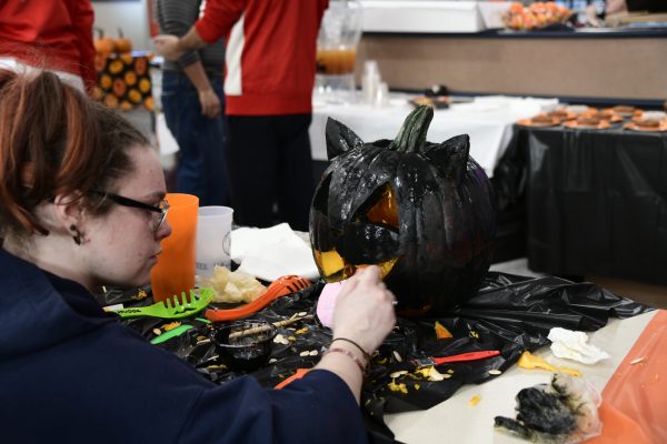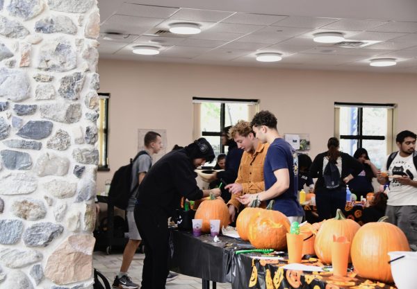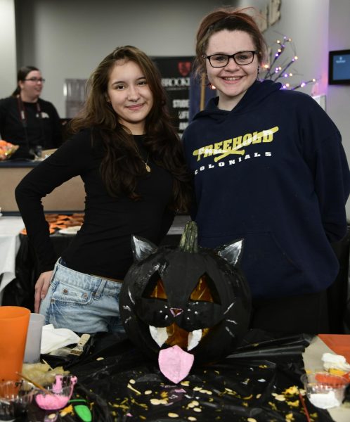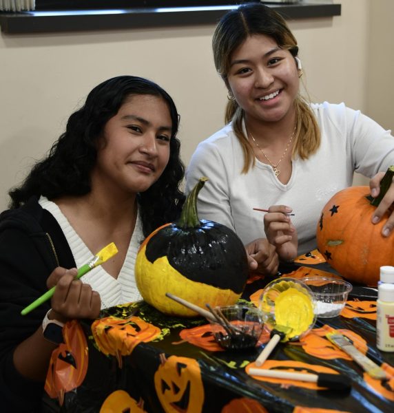 Leslie Bautista, 18 from Long Branch, and Alexandra Lopez, 19 from Freehold, participate in painting pumpkins alongside fellow students and visitors as part of the pumpkin carving and painting contest held on Tuesday Oct. 21. During the contest, cider and a variety of donuts were available thanks to the Student Life Board.
