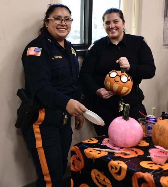 Two Monmouth County officers pose with their own painted pumpkins as they partake in the community event. Having been a success the previous year, the board used allotted funds to put together Halloweek, a week of Halloween related events at Brookdale, to foster community and connection amongst the cohort.